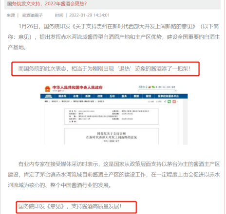 随着中国经济的快速发展和消费者需求的不断扩大,白酒行业的市场规模也在不断增长。酱香白酒本着其特性与文化,已吸引国内白酒饮酒习惯由浓香型、清香型向酱香型逐渐转变,市场份额快速提升。2022年1月26日,国务院印发《意见》,支持酱酒高质量发展!