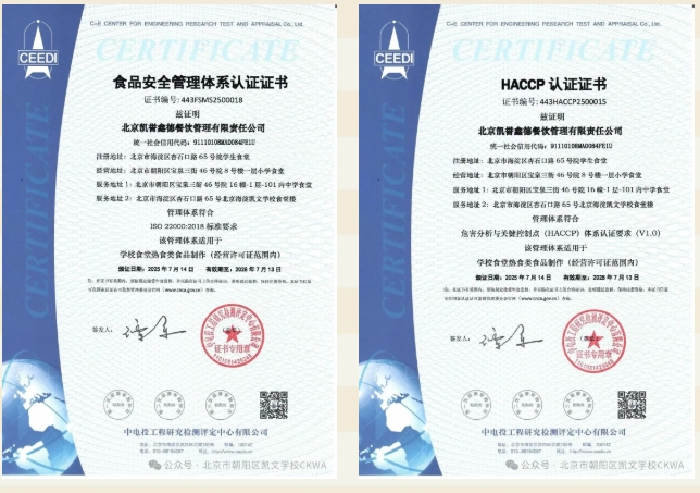 2022年8月,凯誉鑫德通过华信创(北京)认证中心有限公司FSMS和HACCP管理体系认证。认证所依据的标准,无论是ISO 22000:2018,还是GB/T27341,均以HACCP (Hazard Analysis Critical Control Point, 即危害分析与关键控制点),这一世界性的食品质量控制管理的有效办法的基本原理为核心内容,参照了国际食品法典委员会颁布的《食品卫生通则》而制定。